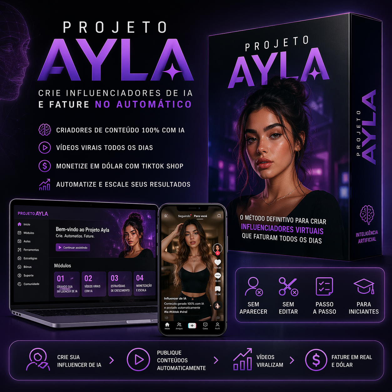 O Projeto Ayla é um treinamento completo que ensina, do zero, como criar influencers virtuais hiper-realistas que postam, crescem e vendem todos os dias automaticamente.